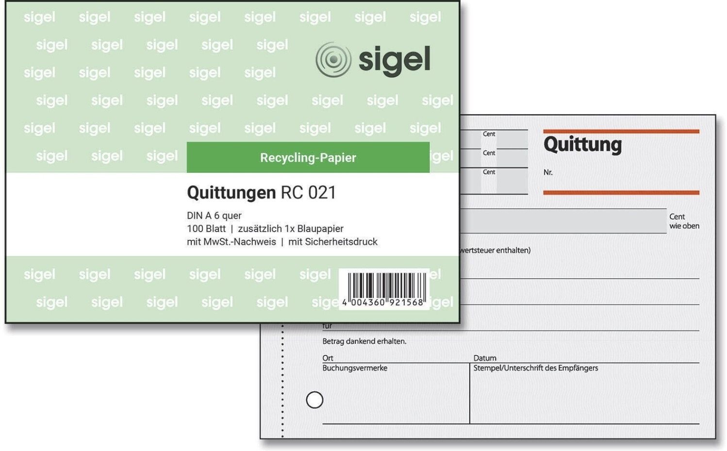 Eigenschaften: "Formularblock Quittung A6 quer 100 Bl. sigel Recyc. Sicherheitsdruck Blaupapier"