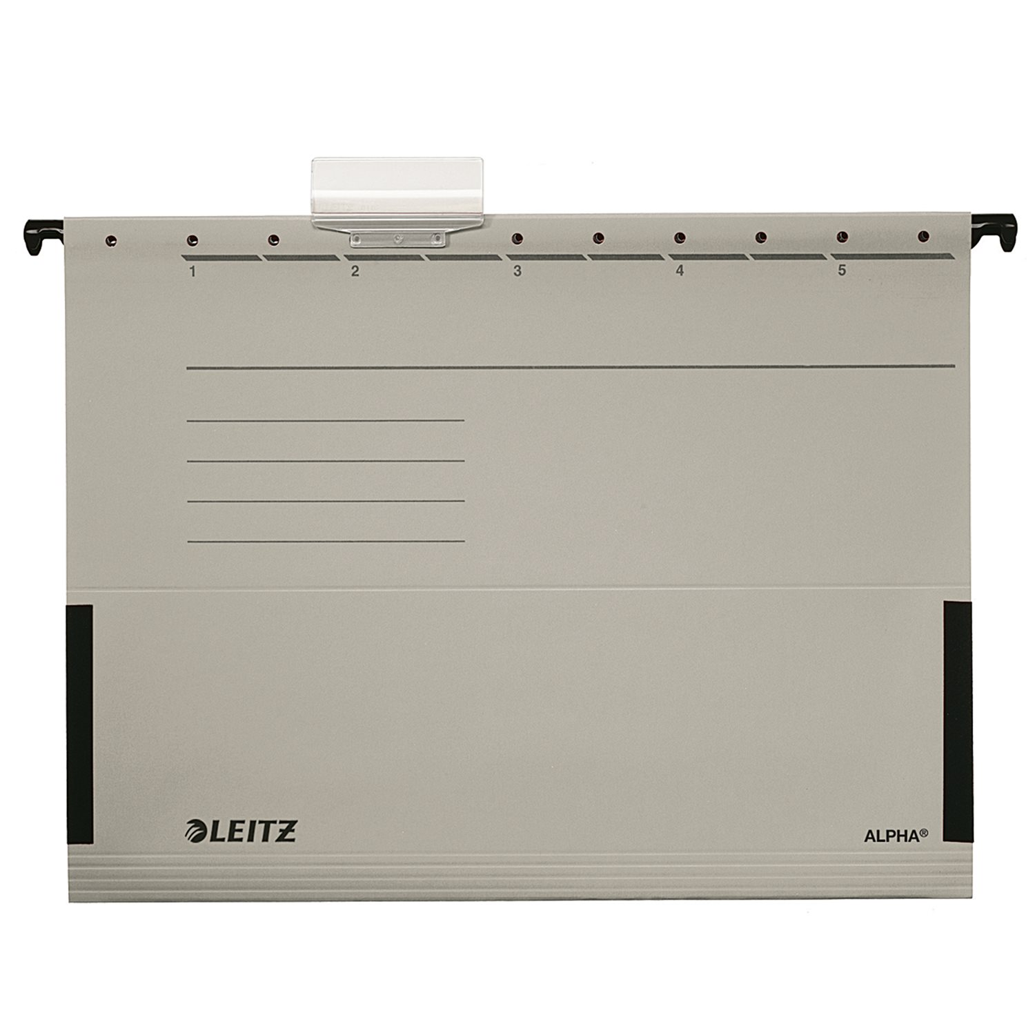 Seitlich mit Fröschen verschlossen. Frösche aus extrem reißfestem Material. Für Loseblatt-Ablage von Einzelakten. Mit Schlitzstanzung für Einsteckheftstreifen (6130), Hängeschiene mit kunststoffumsinterten Hängenasen. Vollsichtreiter und auswechselbaren Blanko-Schildchen.